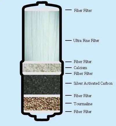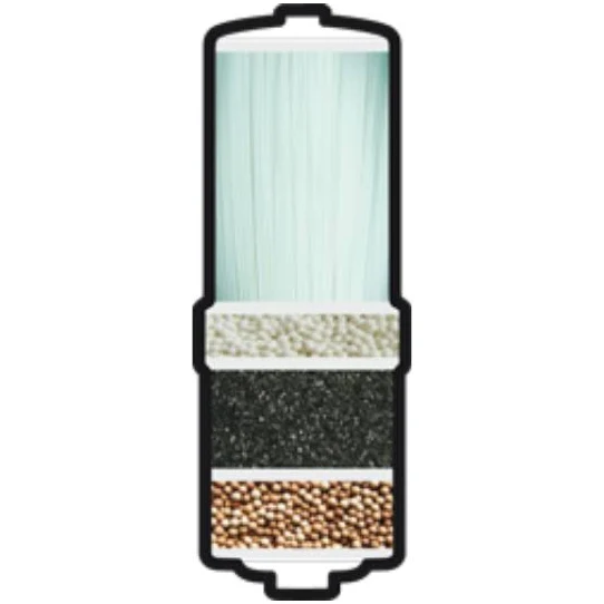 Wymienny, wielostopniowy filtr do urządzenia Aquarion. Filtr zapewnia wytwarzanie zdrowszej i czystszej wody. Zatrzymuje wiele różnych zanieczyszczeń, jednocześnie przepuszczając wartościowe składniki mineralne. Filtr zbudowany jest z kilku warstw, między innymi turmalinu, który emituje w naturalny sposób daleką podczerwień (FIR), co znakomicie działa na wodę; filtru włókninowego odfiltrowującego osady i cząsteczki; granulowanego węgla aktywowanego nasyconego srebrem, szczególnie wydajnego w usuwaniu chloru, jego zapachu i smaku, chemikaliów rolniczych, fenolu, trihalometanu i innych zanieczyszczeń chemicznych. Węgiel aktywowany jest nasycany srebrem w celu zahamowania rozwoju bakterii, gdy jonizator nie pracuje.